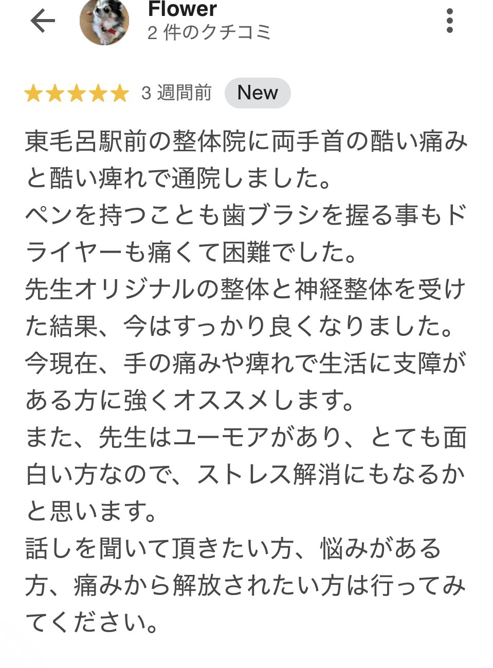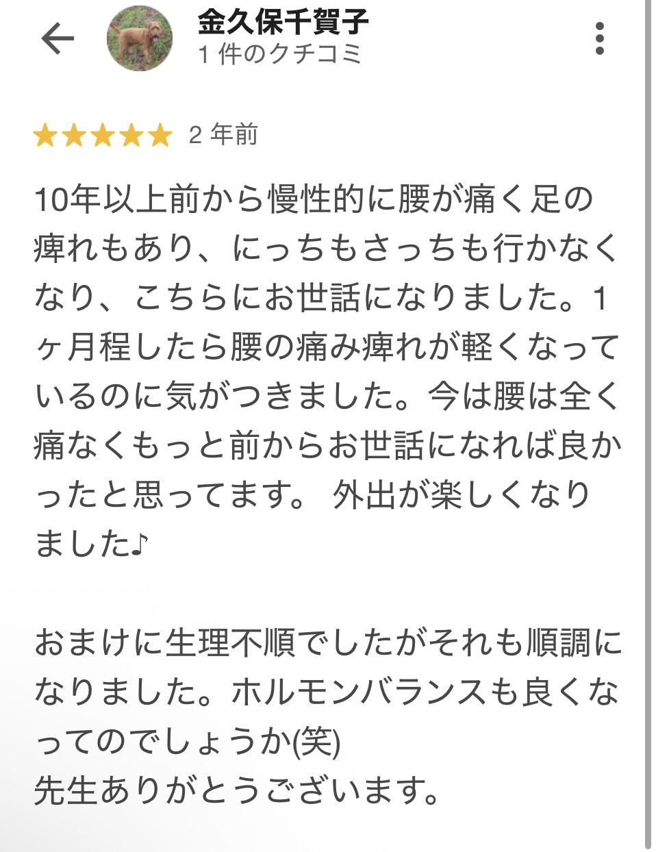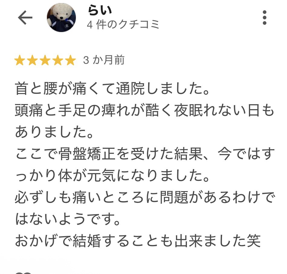 どこに行っても改善しなかった症状でも諦めず、寄り添いながら施術してもらえる、素晴らしい先生です。